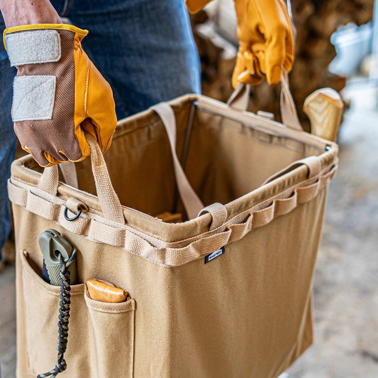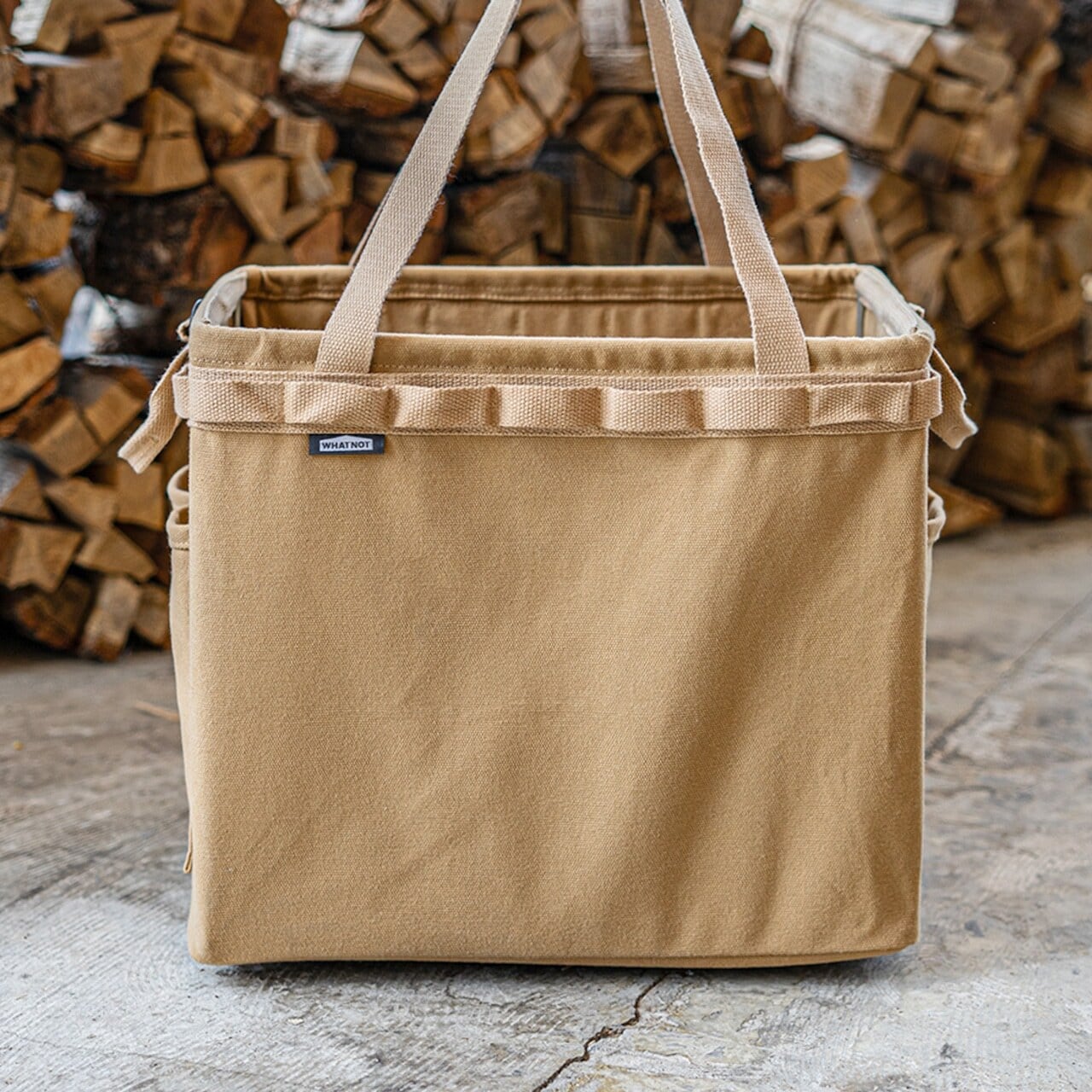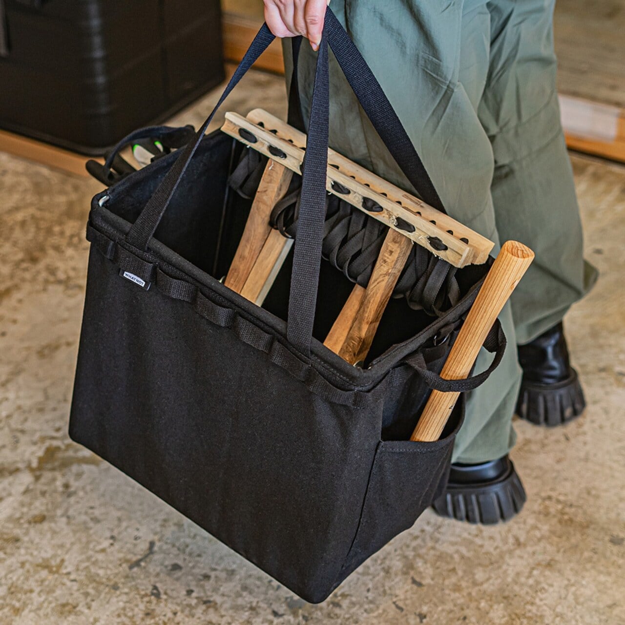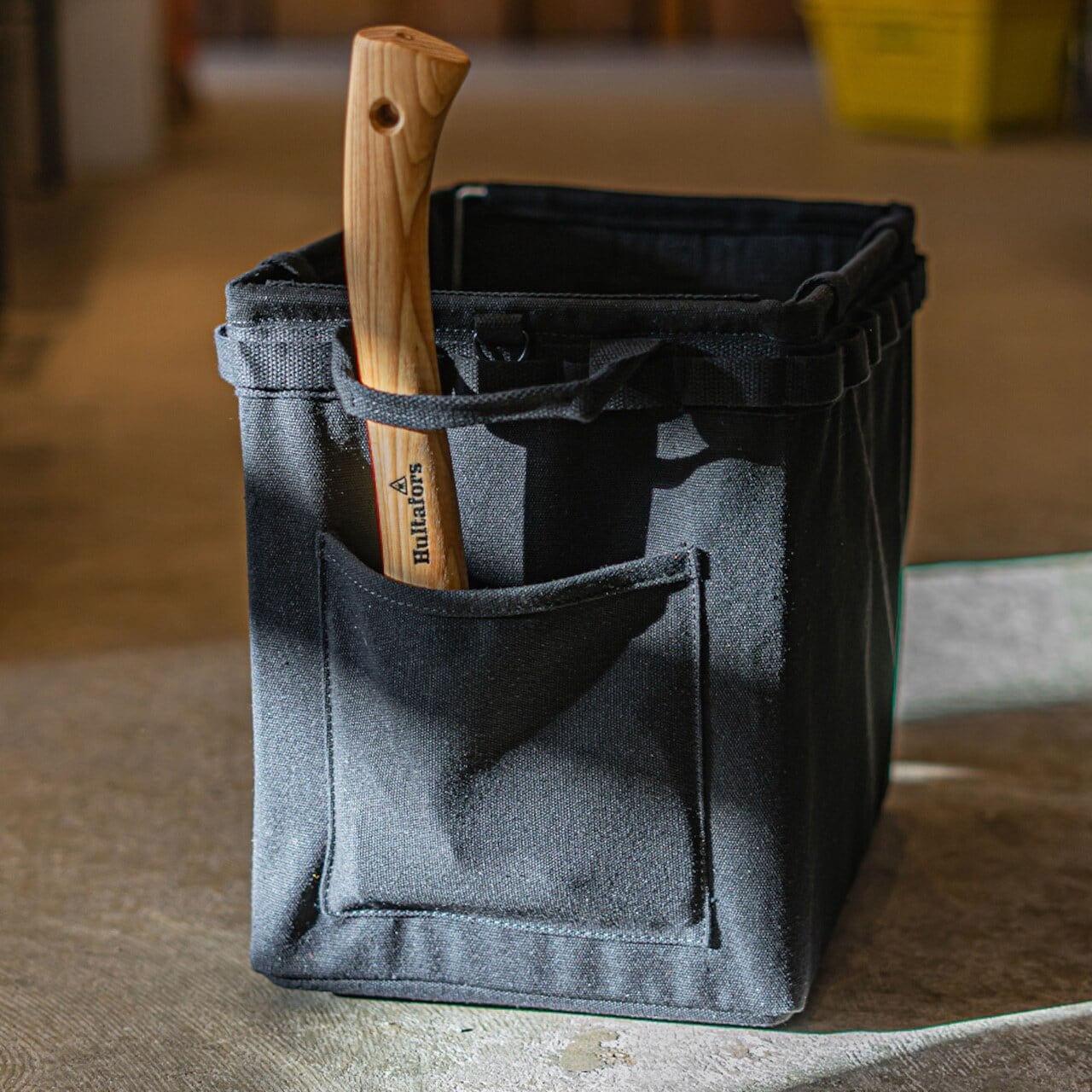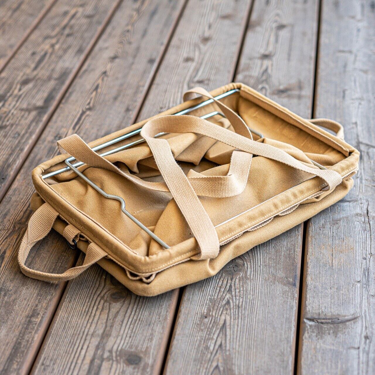 帆布素材ならではの燃えにくさはそのままに、さらに薪などのやや重めの荷物を運ぶことを想定し、フレームをHD(ヘビーデューティー)仕様に変更。
