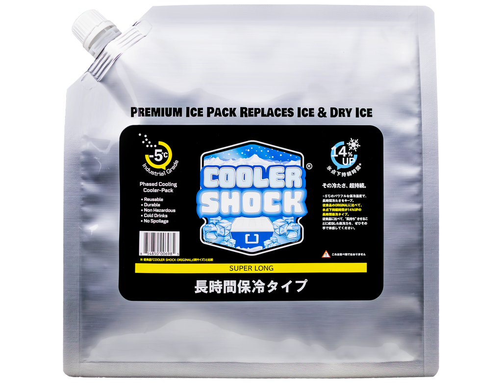 COOLER SHOCKは保冷が長持ちすることが最大の特徴ですが、氷点下温度の持続時間が通常のCOOLER SHOCK“ORIGINAL”よりさらに13%以上長持ちするスーパーロングバージョンが登場。