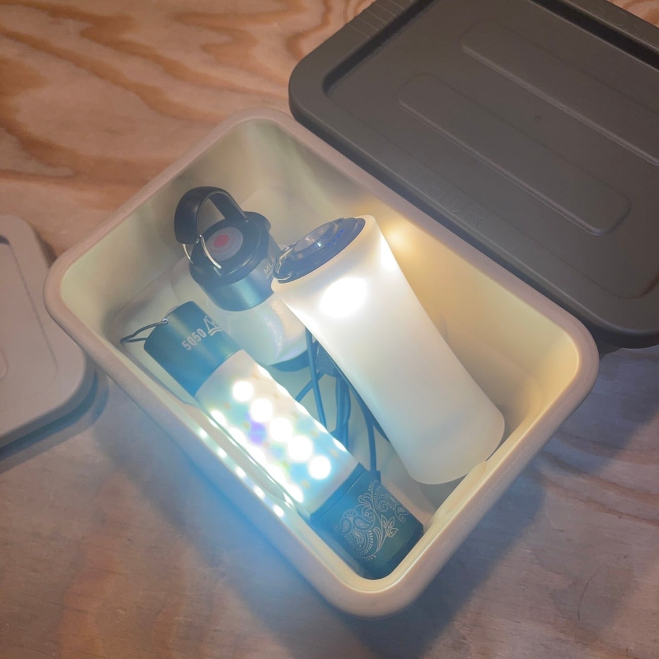細かな物の収納に使い勝手のいいコンパクトなトートボックス。ステーショナリーや工具、アウドドアでは細かなギアやスパイスの収納にもご使用いただけます。THOR LARGE TOTE22Lの底面に4個、2段の最大8個収納可能です。