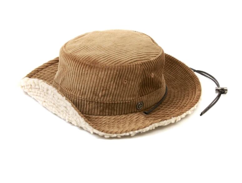 つば裏のボアが見た目も暖かでキャンプファッションにもマッチし、